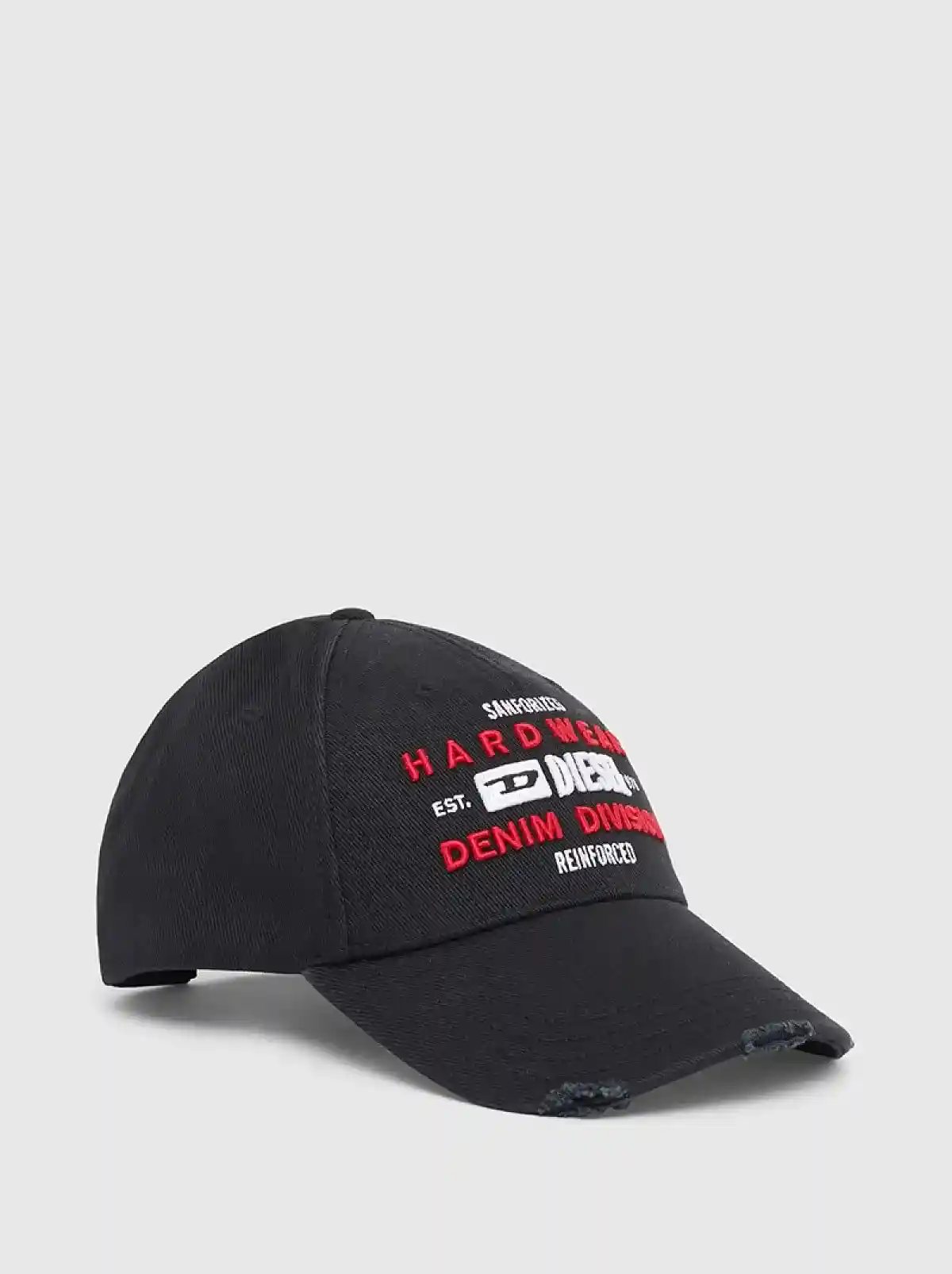 Baseball cap cut from washed cotton twill. Detailed with distressed detailing on the peak and an embroidered Diesel Denim Division logo across the front.