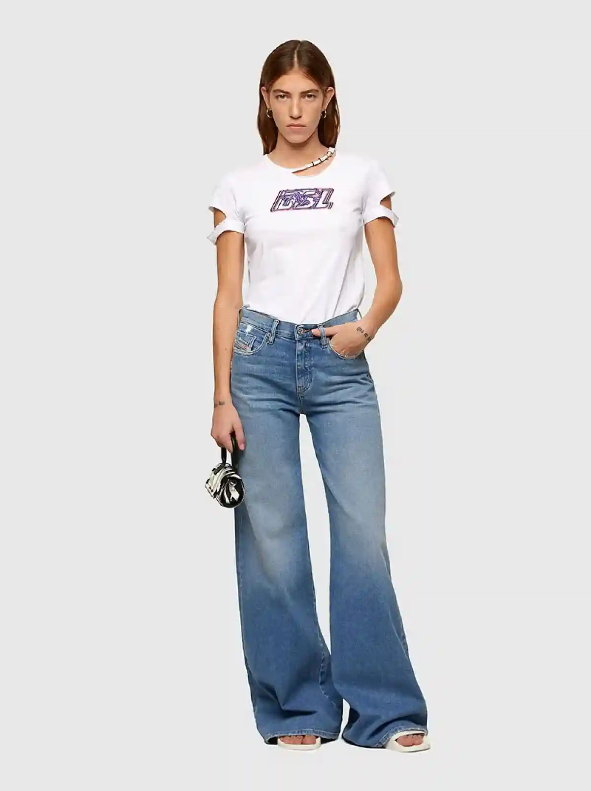 Slim-fit T-shirt in substantial cotton jersey, featuring cut-out sleeves and a partially unstitched collar detailed with hexagonal metal hardware. The smudged DSL logo on the front is created with plastisol print and 3D embroidery.