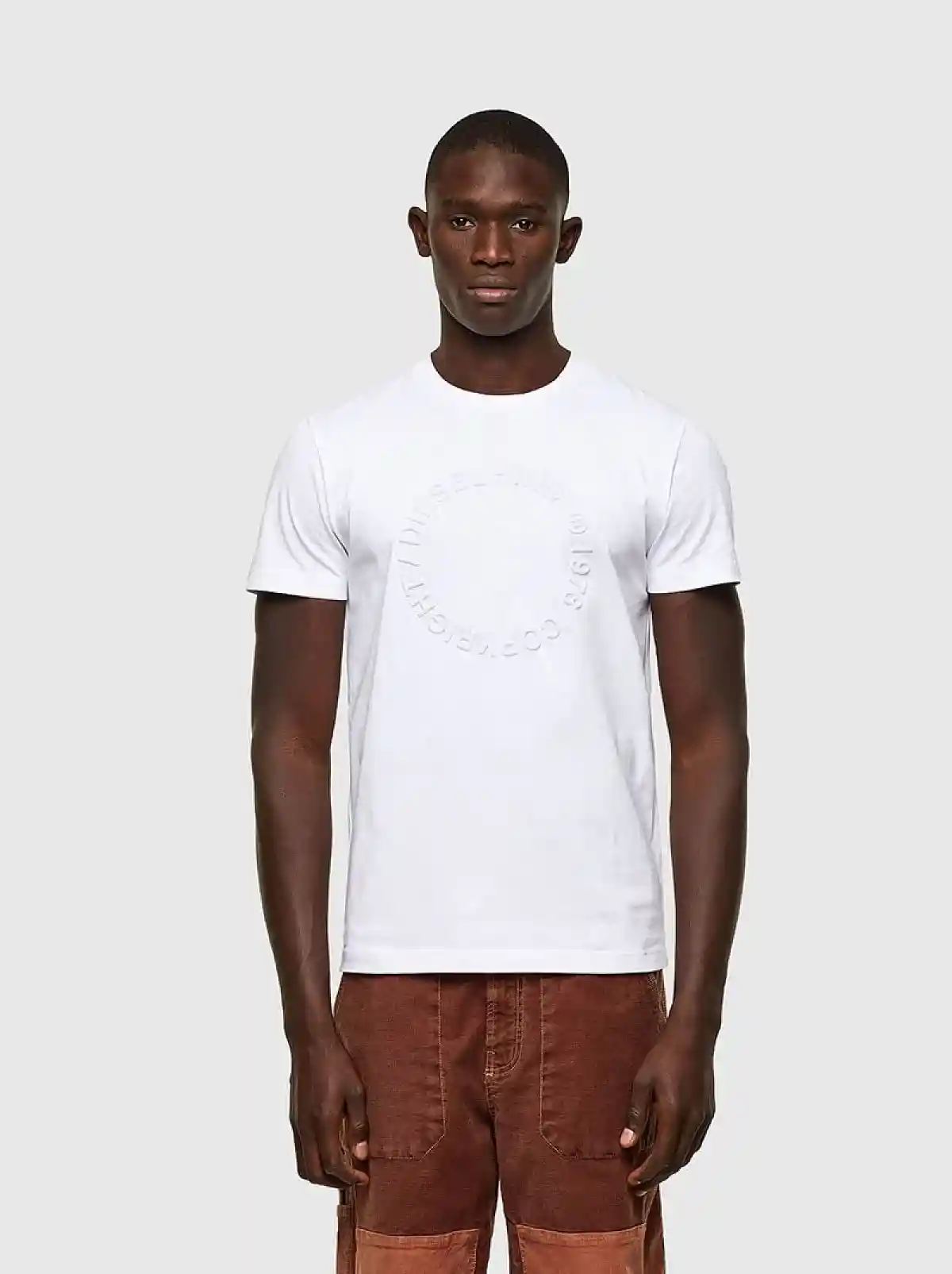 Crew-neck T-shirt in substantial cotton jersey, cut for a slim fit. The style features a circular Diesel Copyright logo embossed on the front in high relief.