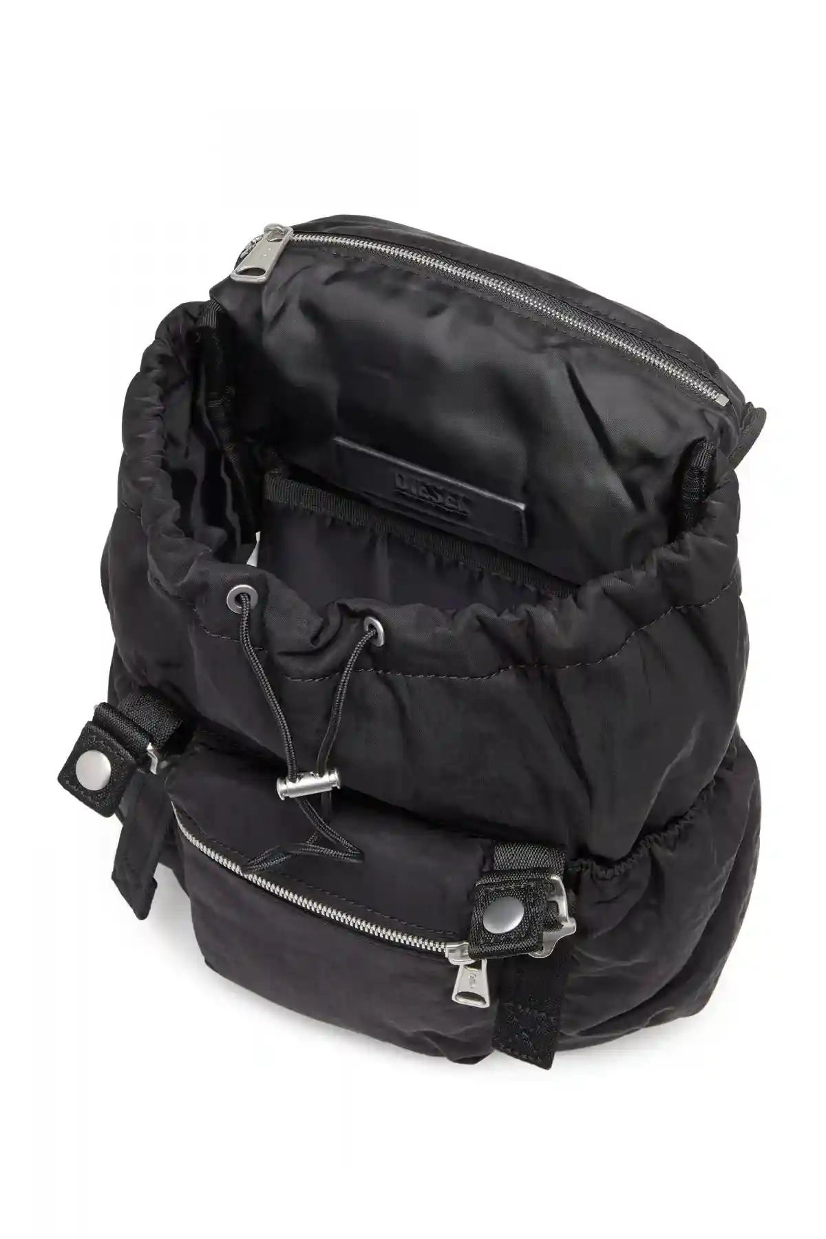This unisex backpack is crafted from washed recycled nylon, and features a compact shape with a double-buckled flap and drawstring top. The flap is detailed with metal Diesel lettering and a branded plaque. Logo-shaped pullers complete the design.